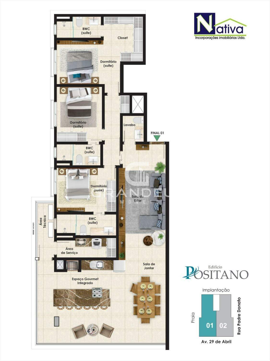 Apartamentos tipo (Final 01) a partir do 4 andar. Os apartamentos serão compostos por 3 suítes, sala de estar em conceito integrado com a sala de jantar, lavabo, área de serviço e 2 vagas de garagem (Numeradas). Além desta disposição, o edificío contará com um rooftop incrível com piscina adulta e infantil com uma vista plena para o MAR, praia box e bicicletário.